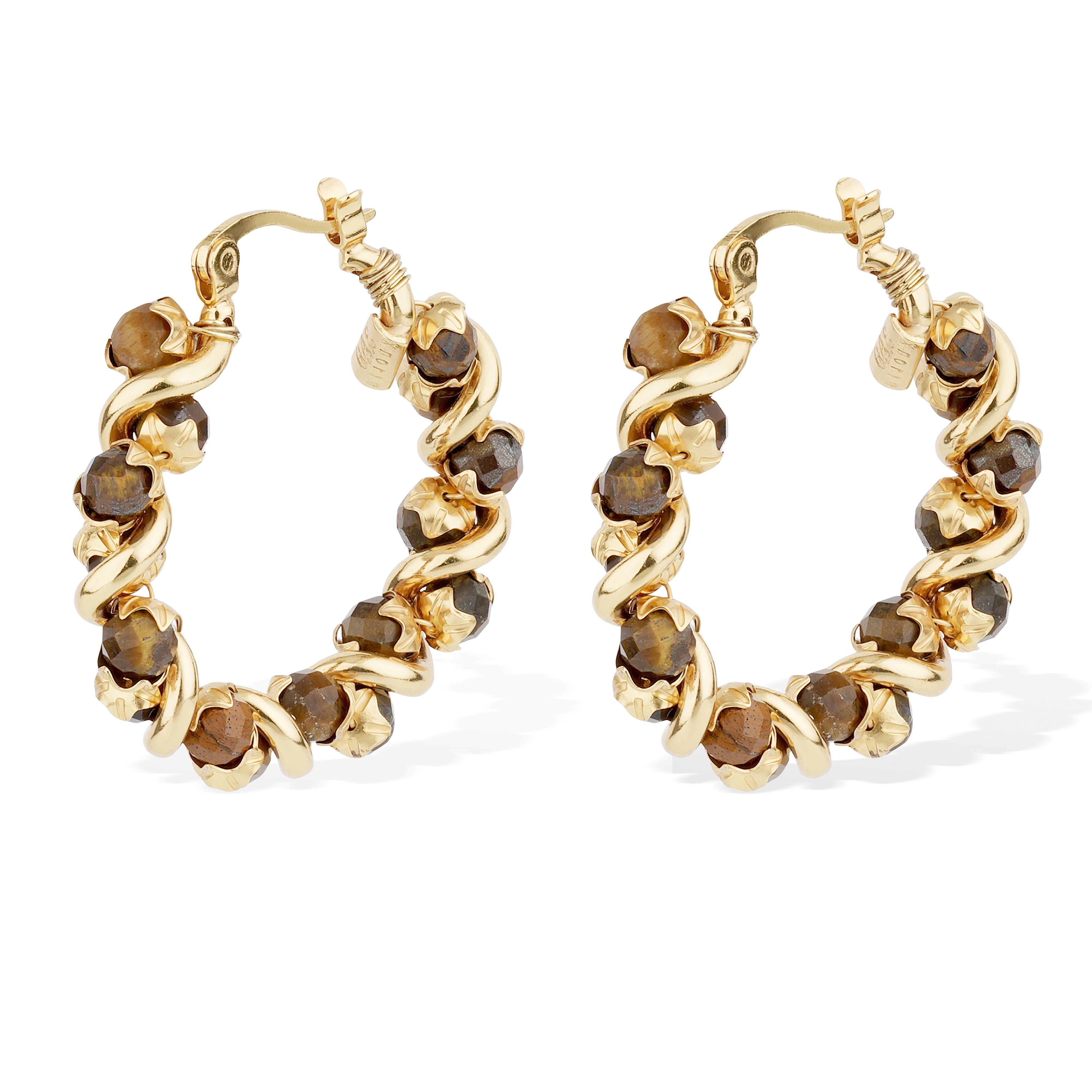Gold-plated Eurydice earrings featuring delicate brown crystal beads, symbole of chance, intertwined with an elegant metal wire.