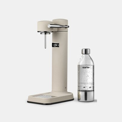 Minimalist sparkling water maker featuring compact design and classic finishes.